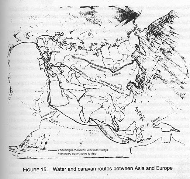 Before leaving the subject of the great power-structure struggle for control of the most important, greatest cargo-tonnage-transporting, most profitable, Asia-to-Europe trade routes, we must note that the strength of the Egyptian Empire was predicated upon its pre-Suez function as a trade route link between Asia and Europe via the Indian Ocean, the Red Sea, overland caravan to the Nile, and then water-borne to Alexandria, or via Somaliland, overland to the headwaters of the Nile, and thence to Alexandria. The latter route was not economically competitive but was the route of travel of the ship-designing and -building arts that in due course brought the stoutly keeled, heavily ribbed, big-bellied ships into the Mediterranean.We have seen the Greek Alexander the Great crossing Persia and reaching the Indian Ocean, thus connecting with the Phoenician trading to Asia. A thousand years later the Crusadersostensibly fighting for holy reasonswere the Indian Ocean-Phoenician-Venetian-Veeking water-borne power structure fighting the older overland-Khyber Pass power structure over mastery of the trade route between Asia and Europe.