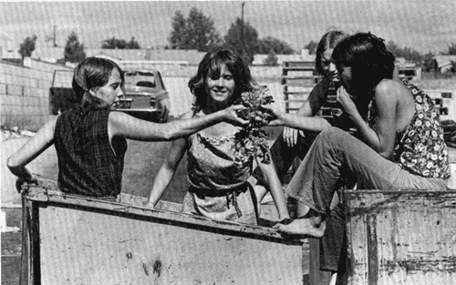Lynnette Fromme, Sandra Good, Mary Brunner, and Ruth Ann Moorehouse eat trash in back of a supermarket.